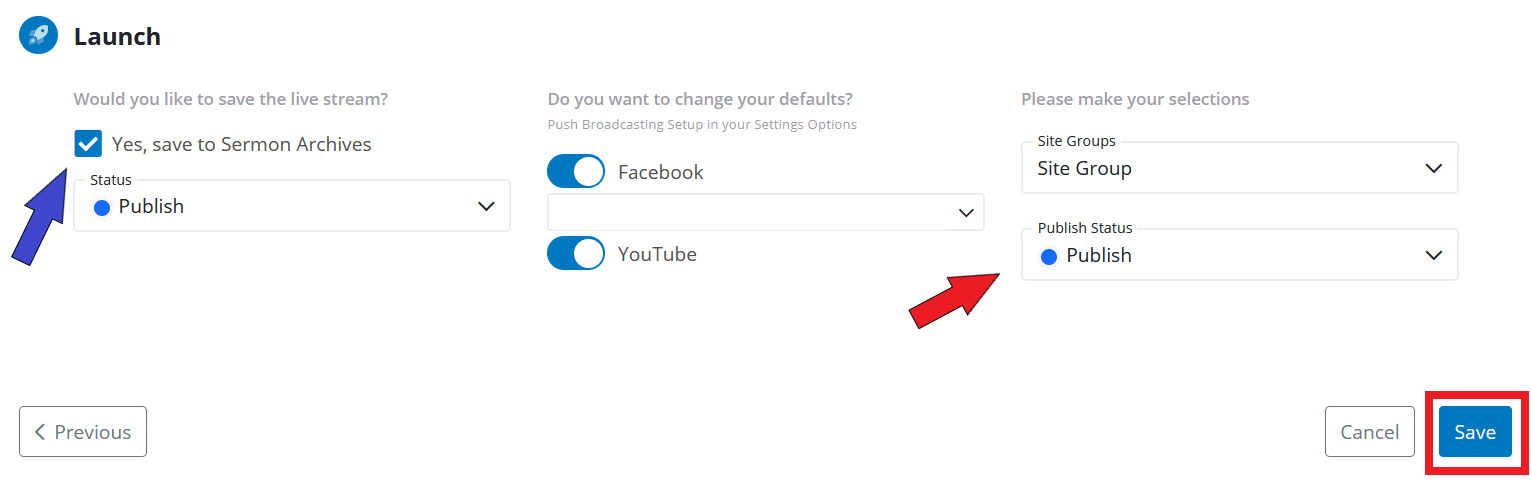 - If you want the stream to be saved to the Sermon Archive, check the box. Then choose if you want to publish to your archives right away or you can leave it in draft mode so you can add more information about your stream (bible passages, speaker notes, etc) later