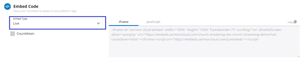 - For Live select the embed type as live or for archived select the archives from the dropdown