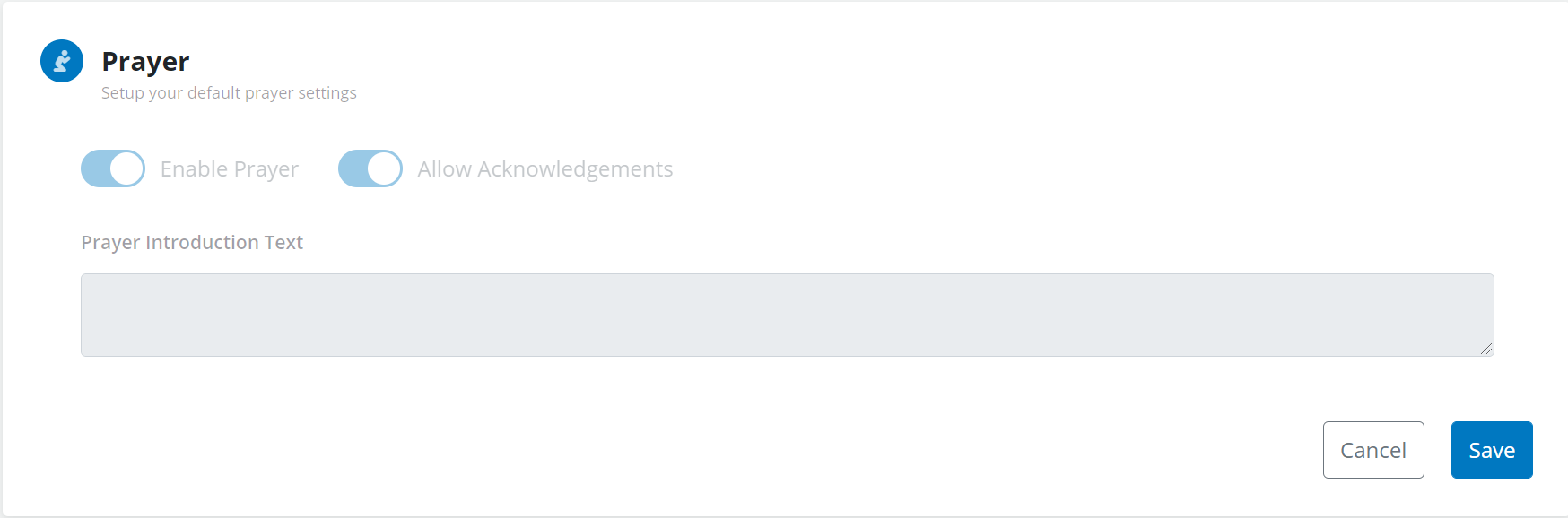 - The Prayer section is where you can enable our built-in prayer feature as apart of your live stream as well as add in any introduction text inside the prayer section when your service starts.