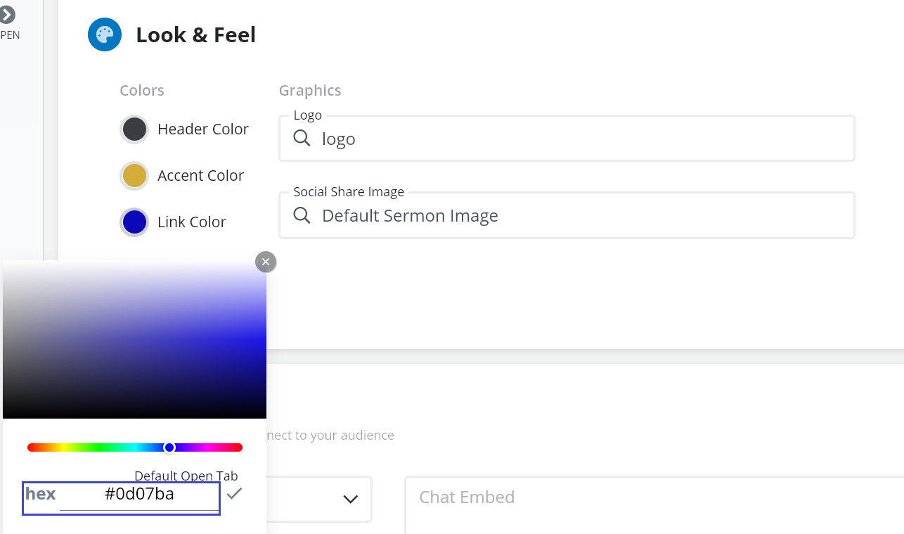 - The next section is the Look & Feel section. This is where you can customize the colors of your streaming page to match your church branding. You will be able to add the hex number to perfectly match your colors.