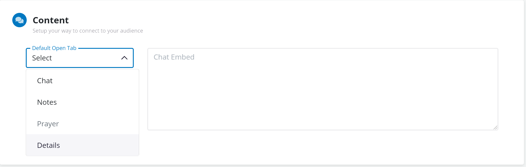 - The Content section is where you would be able to add notes, details, or add a chat embed code if you are wanting to use a third-party live chat feature with your live stream.