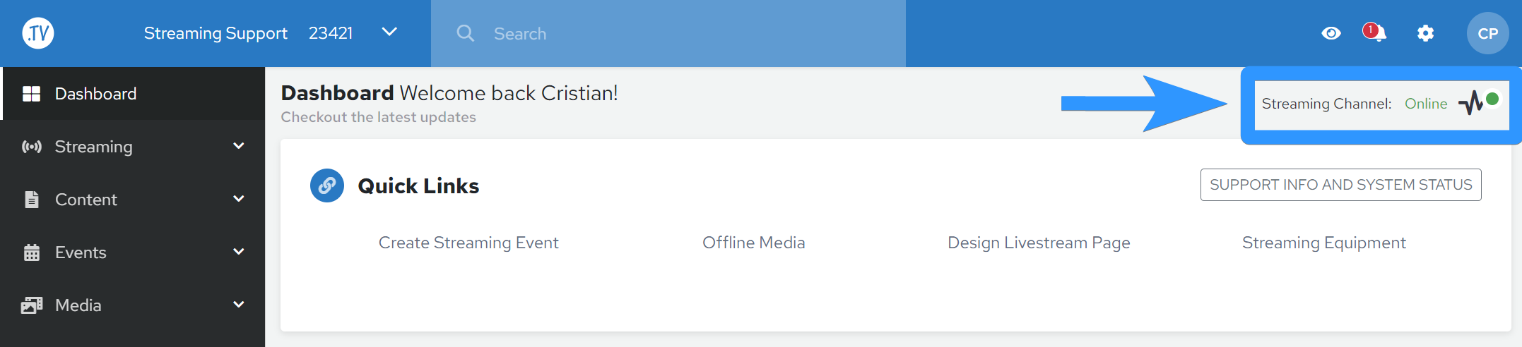 1. 15 minutes prior to the start of your event, the Streaming Channel area of your Dashboard will display a green indication that your Channel is online and ready to receive your stream