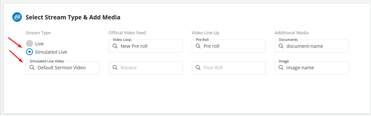 - You will need to check the circle next to “Simulated Live” and then choose your file. After this, you will save the event at the bottom and the event will play the selected file at the chosen time